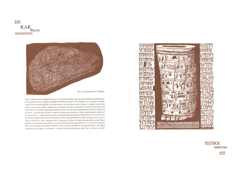 Киплинговский идеальный человек, владетель мира, появляется и в «Сказках слово в слово» – то в образе Моряка, то в образе Вождя. Как стать этим идеальным человеком, рыцарем без страха и упрека? Один из ответов на этот вопрос содержится в так называемом «тегумайском цикле». Три сказки этого цикла повествуют не о животных, а о людях из семьи «простого Первобытного Человека» по имени Тегумай Бопсулай (что значит «Человек-который-ни-за-что-не-станет-торопиться»). В сказке «Как было написано первое письмо» дочь Тегумая Таффи отправляется с отцом на рыбалку и случайно изобретает письменность. А через неделю после этой истории Таффи, вновь оказавшись на рыбалке, придумывает алфавит, о чем рассказывает вторая сказка цикла. В третьей истории Тегумай, Таффи и вождь племени накладывают табу на свою реку, чтобы сохранить в ней рыбу («Истории про тегумайские табу»).
