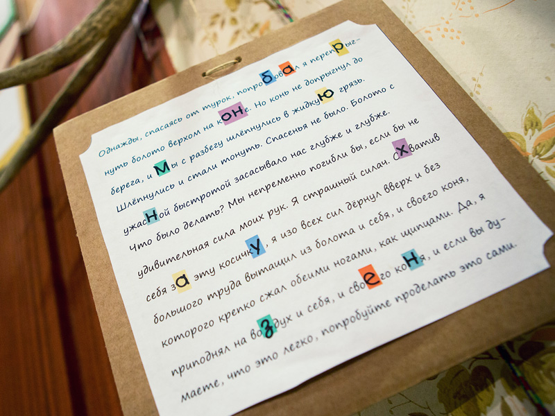 Какие игры с текстом можно придумать в связи с этими предметами? Во-первых, как это предложили создатели выставки, отгадывать, какой текстовой отрывок с каким предметом связан (это вообще универсальный принцип). Во-вторых, можно делать «книжные пазлы». Выбирается несколько отрывков (например, три текста), они печатаются, потом разрезаются на части (три или четыре). Играющие получают набор карточек. От них требуется из предложенных текстовых кусков собрать три цельных отрывка. Участники игры могут даже не знать самого произведения ‒ в этом случае им придется ориентироваться на свое стилистическое чутье.