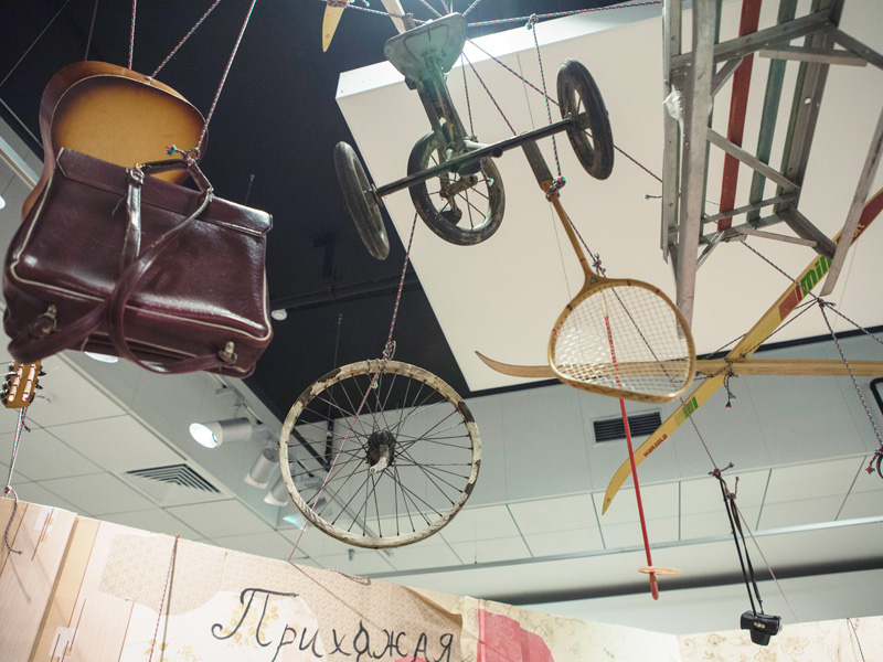 Прихожая «Дома книги» причудливо сочетает «книжные реалии» и слегка ностальгические «цитаты» из квартирного быта позднего советского времени (в том числе и коммунального). Потолок прихожей – своеобразная инсталляция, состоящая из подвешенных над головой лыж, санок, коньков, старых портфелей, гитар и всякого бытового «хлама», который можно обнаружить в глубине какой-нибудь труднодоступной антресоли. Эти бытовые реалии призваны напоминать о «фоне восприятия» ‒ том времени, когда с любовью и даже страстью читались книги, ставшие главными действующими «персонажами» выставки. На одной из стен висят карточки с отрывками из литературных текстов, в которых упоминаются эти вещи. Можно прочитать цитату, найти вещь под потолком и попытаться отгадать, из какого произведения эта цитата. Ответ дан на обороте карточки.