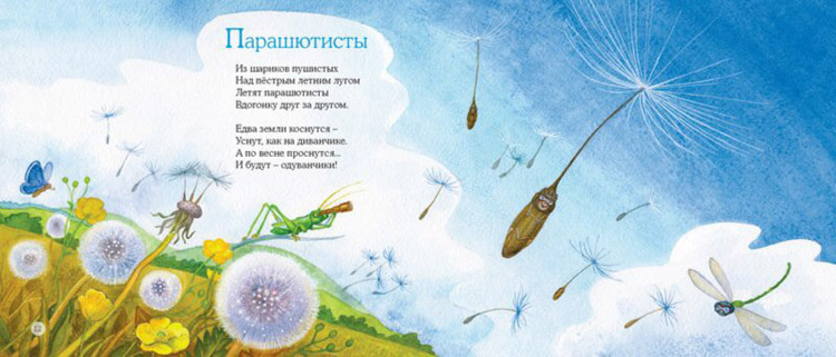 Оно очень легко запоминается. Ненавязчиво подталкивает рассмотреть устройство цветка. И превратить просто веселую игру в осмысленное занятие – Ксюше особенно нравится помогать одуванчикам сеять свои семена. И еще обязательно нужно присоединиться к семенам-парашютам и вместе с ними лететь, кружиться, приземлиться в уютном месте и «заснуть» до поры до времени. А зимой так хорошо неожиданно наткнуться на книгу с «Парашютистами» и перечитать, но уже с теплыми воспоминаниями о лете.