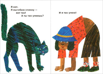 С этой точки зрения, одной из самых удачных малышовых книг для «читательского старта» оказывается книжка Эрика Карла «От головы до ног». Там между картинкой и текстом «вставлено» движение. На одной странице – животное, которое «заявляет» и словами, и позой что-нибудь вроде: «Я умею выгибать спину. А ты так умеешь?» На другой – ребенок, который это движение повторяет.