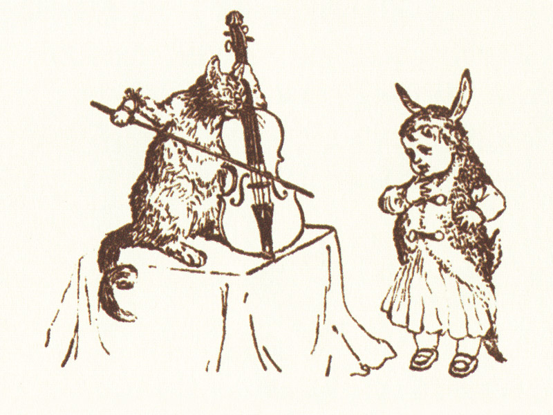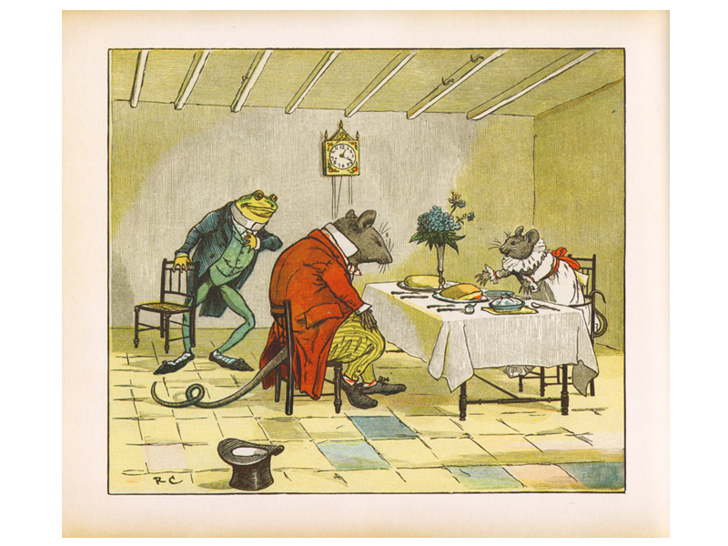 Вот, к примеру, история про несчастного лягушонка, мистера Кроули, который «пошел невесту искать». История, прямо скажем, трагическая. Такая английская версия тезиса о тщете существования, о равнодушии мироздания и о смерти как части жизни. Неотделимой части. Видимо, чтобы подчеркнуть это, подчеркнуть превратности индивидуальной судьбы, Кальдекотт вводит в рисунок «сторонних наблюдателей». С одной стороны, в истории действуют «фрики» из «Nursery Rhymes» – лягушонок, крысенок (одетые по-человечески, как настоящие денди) и мышка (прекрасная дама), с другой стороны – куда-то идут и «невольно» оказываются свидетелями происходящего викторианские дети и взрослые, о которых в тексте – ни слова. И нельзя сказать, что события – как желание лягушонка жениться, его влюбленность с первого взгляда в симпатичную мышку, так и внезапное нападение кошачьего семейства на «сентиментальное собрание» – вызывают у этих свидетелей удивление. Отнюдь нет. Они наблюдают за всем происходящим с грустной задумчивостью: вот она, бренность жизни… Поскольку бренность жизни демонстрируется, как уже было сказано, на примере абсолютных фриков, лишь прикидывающихся человекообразными, то неподдельное и сверхсерьезное внимание к ним истинных леди и джентльменов заставляет нас улыбнуться.