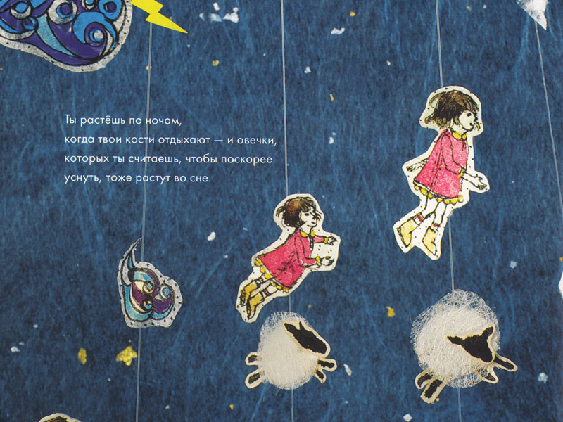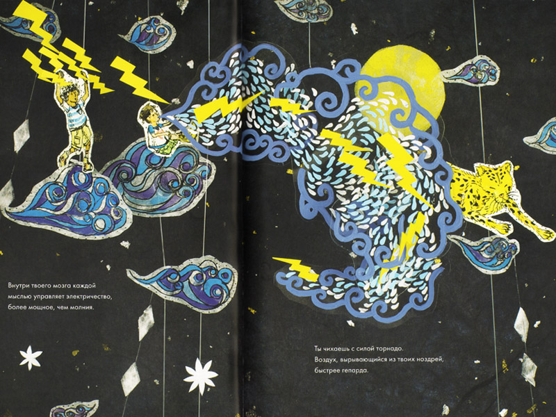 Иллюстрации Сойон Ким перекликаются друг с другом и сообщают книге, состоящей из разрозненных любопытных фактов, целостность и гармонию. В этой дебютной работе художница сделала сложные трехмерные композиции из самых разных материалов: бумага, ткань, нитки, сухие растения. Вот что она рассказывает об оформлении последнего разворота книги: «Когда киты плавают, кажется, что они летают по синему небу. На этой диораме киту предоставляется возможность “полетать по воздуху”». Мы видим, что мальчик устроился на спине у плывущего в небе кита, внизу бредут друг за другом разные животные, и вокруг них светятся «звездные» кристаллы. Это выражение главной идеи книги: «Все мы – природа. Все мы – звездная пыль».