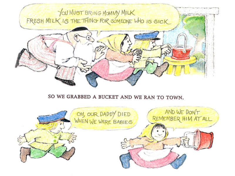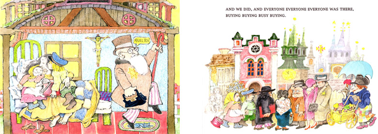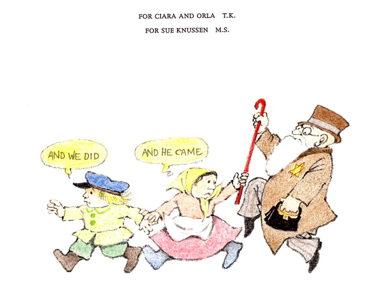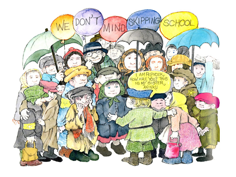 В книге Сендака и Кушнера уже на второй странице можно обнаружить шестиконечную звезду Давида ‒ вот она, пришита на пальто врача, который приходит к больной матери Анинки и Пепичека. Звезда подмигивает нам с одежды гуляющих по городу взрослых и с рукавов школьников, которые потом помогут победить Брундибара. Хотя для сюжета совершенно неважно, кто отмечен звездой, а кто нет. Более того, Сендак подчеркивает: «Я специально нарисовал распятие на стене у кровати матери, чтобы не думали, будто Анинка и Пепичек – это еврейские дети. Что это история исключительно про еврейских детей. Аничка и Пепичек - это просто Дети, оказавшиеся в плохом месте в плохое время. Такие дети все становятся жертвами Холокоста».