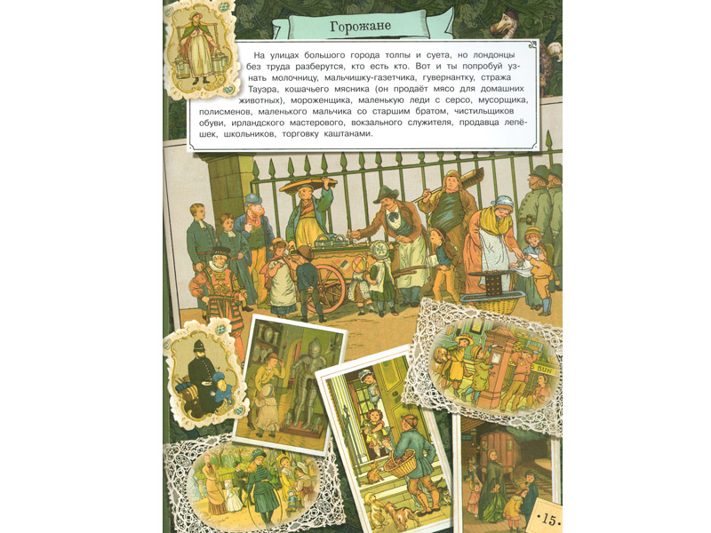 Книжка, выпущенная издательством «Лабиринт», действительно замечательная – многослойная, подходящая для детей самого разного возраста, интересов, читательского опыта. Иллюстрированная исключительно картинками из викторианской эпохи, она может быть интересна для рассматривания с небольшим родительским комментарием даже малышам лет четырех-пяти, особенно если они уже знакомы с «Песенками Матушки Гусыни» в переводах Маршака и Чуковского. Это и будет для них та Англия, где действуют Шалтай-Болтай и другие любимые герои. Но наибольший интерес книжка вызовет у младших школьников, давно и самостоятельно читающих. Это книга-путешествие, настоящая энциклопедия жизни старой доброй Англии, где в коротких рассказах перед читателем открывается обширная панорама – архитектура, мода, английские изобретения и деньги, британские колонии и правила сочинения лимериков, игры английских детей двухсотлетней давности, которые до сих пор могут быть интересны.