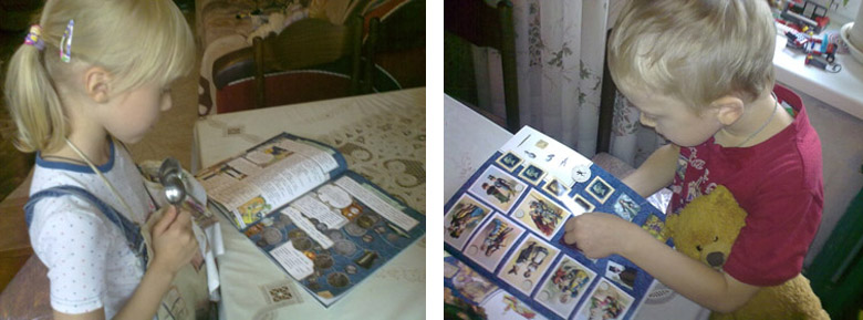 Еще сложнее и интереснее было погружаться в домашний мир английского поместья, примеряя на себя роли хозяев и слуг. Ох и трудно, оказывается, быть английской служанкой или кухаркой в XIX веке – подать завтрак хозяевам нужно ровно в девять, в полдень явятся гости, а требуется еще переделать кучу дел: погладить платье хозяйки, купить мясо и зелень, сварить обед, сбегать в сад за персиками и проварить их в сахаре (список дел прилагается, да еще с условием, что один человек за час может справиться только с одним поручением). Сколько же нам пришлось повозиться с этим списком, чтобы все исполнить и ничего не перепутать! Да еще потом бежать за покупками по поручению кухарки миссис Таккет – купить кофейник за 13 пенсов и яблоки за 5 фартингов, притом что монеты в кармане только такие: шиллинг, полукрона, трехпенсовик и пенни, а купить нужно все без сдачи. Опять пришлось попыхтеть, вычисляя. Но зато забава из книжки имела нечаянное и мгновенное продолжение в виде ролевой игры: Аня надела фартук, вооружилась ложками и окончательно вошла в образ грозной кухарки. А Макар превратился в лакея Томаса, который должен был успеть прогладить утренние газеты для хозяина, лорда Блэквуда («Надо же – газеты прогладить! Вот бы нашему дедушке так!»). Еще немного – и они породили собственную сюжетную линю жизни в поместье Блэквуд, которая, как водится, заканчивается свадьбой…
