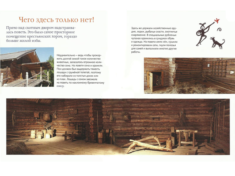 Прежде чем приступить к постройке, искали хорошего плотника. Потом надо было правильно выбрать дерево – это целая наука. Дерево нужно доставить к месту постройки и обработать правильным образом. Автор рассказывает обо всех старинных строительных секретах: и как настелить пол, и как сделать крышу, окна, косяки, наличники… Сколько тонкостей, оказывается, в постройке правильного дома. Из книги можно узнать и об отличии одного помещения от другого, о названии и назначении каждой части избы. Вот, например, окна. «Окна – глаза дома. Через них хозяева видели, что происходит на улице, любовались восходом и закатом солнца. Поэтому самые большие окошки дома смотрели на улицу и на реку. Эти окна назвали красными или косящатыми… Через волоковые – от слова волочить – окна выводили (выволакивали) из избы дым от печи». В тексте много слов, связанных с крестьянским бытом и деревянным строительством и незнакомых большинству читателей. Но подробные иллюстрации с обозначенными и подписанными деталями и узлами дома превращают знакомство с новыми терминами в увлекательное занятие. В книге упоминаются многие обычаи, связанные с каждой частью избы. «Помнишь поговорку “Плясать от печки”? Ее смысл в том, что всё в доме начинается с очага. Сердце и душа северного дома – изба с большой русской печью».
