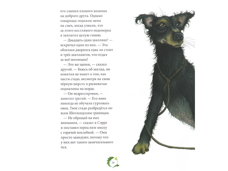 А еще в книге есть история, заметно выделяющаяся из общего сказочного потока. Это «Пес и пастух», и ее с полным основанием можно назвать легендой, сложенной по реальным событиям. Двести лет назад добрый пастух спас от злого хозяина тощего молодого пса. В тексте пес проходит как колли, и Ваня, юный кинолог-теоретик, знает, что существует несколько разновидностей этой пастушьей собаки. На иллюстрации псина выглядит куда жальче, чем благородные колли из «Атласа пород собак». Ну да ладно. Мы с Ваней решаем, что красота для героя – не главное, а такой собачий подвиг – собрать в ночи огромное стадо вырвавшихся на свободу ягнят – мог быть совершен и двести, и тысячу лет назад, и в наше время. Милая деталь: пес Сэрра имел музыкальный слух и мешал петь псалмы хозяину во время воскресной службы, подвывая ему и вызывая хохот паствы. Но это говорит лишь о том, что подвиг могут совершить даже те, над кем раньше лишь смеялись и в кого никто не верил. Ваня: «История про пса Сэру – это точно легенда. Наверняка на самом деле был такой пес, очень умный, который загнал скот в ущелье, где он мог его охранять и держать в безопасности».