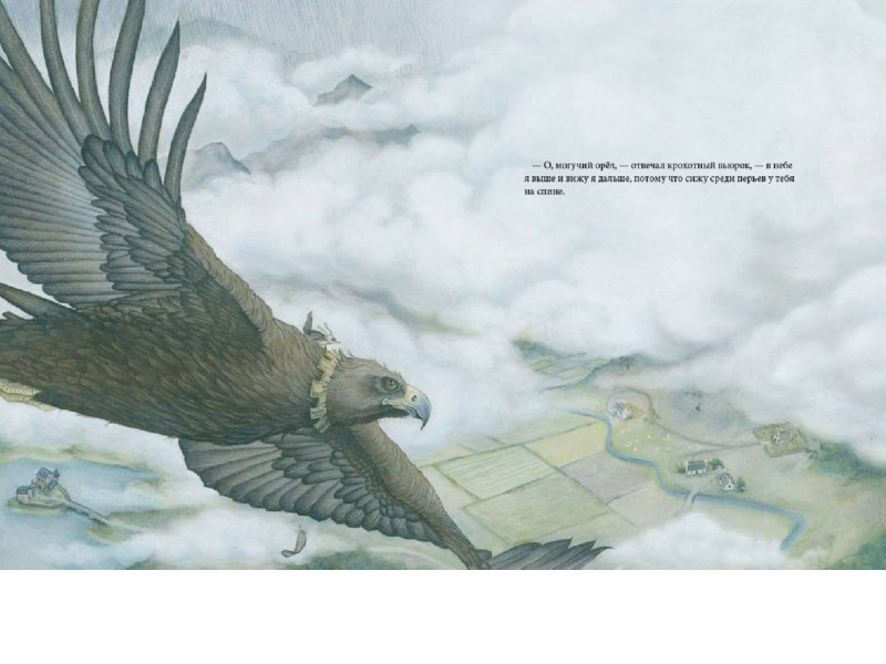 Сказка-легенда про злобного водяного духа кельпи оказалась куда более пугающей, и именно к ней относится самая мрачная, «ночная» иллюстрация книги – огромный конь, бьющий копытом и пускающий пар из ноздрей. Конь-кельпи утащил на дно Лох-Несского озера пожилого крестьянина, а его смышленый и храбрый сын с помощью старушки-волшебницы смог перехитрить и одолеть кельпи. К развязке этой сказки Ваня подошел рационально и сказал, что можно было бы обойтись и без волшебства, ведь чисто технически «для победы хватило бы обычного пледа, соли и уздечки». Кстати, несмотря на очевидную победу добра над злом, отец-крестьянин в семью так и не вернулся, и эта печальная деталь также сделала легенду более «взрослой» в глазах детей.