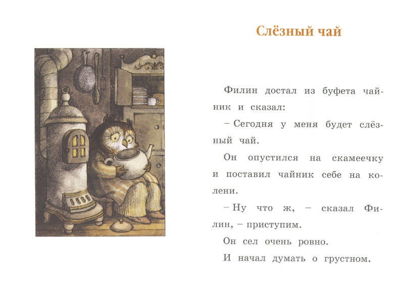 Другой рассказ вызвал у Федора недоумение. Филин решил приготовить себе «слезный чай». Для этого ему надо было подумать о грустном и наполнить чайник слезами. Федор очень редко плачет. Мне кажется, он совсем не понял, почему сломанные стулья, затерявшаяся ложка или остывшее пюре могут стать поводом для слез. Уж лучше покричать, если расстроился, или взять и починить стулья, чтобы не переживать. Однако, как и в случае с гороховым супом, Федор был рад, что Филин напился слезного чая и успокоился.