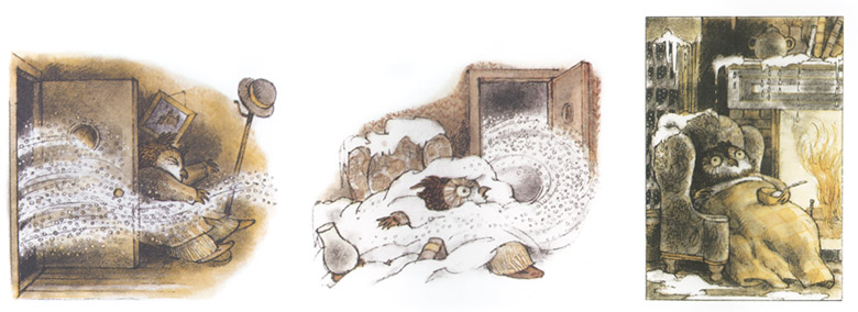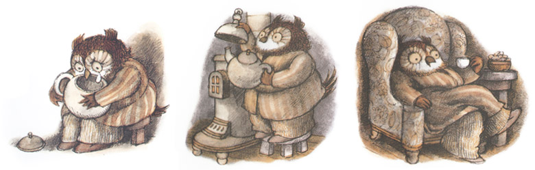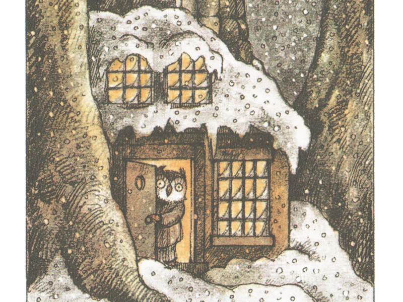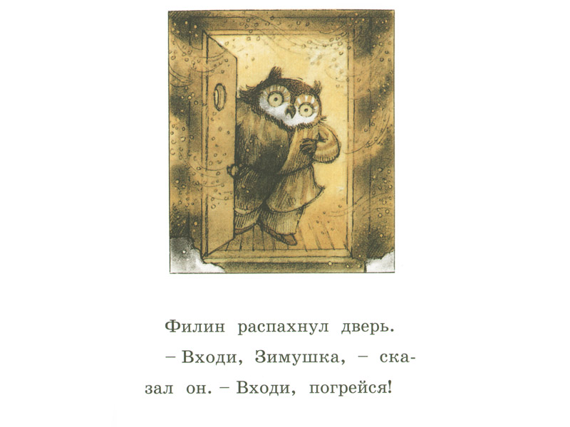 Книга оказалась чудесной. Самый любимый рассказ Федора называется «Гостья». Филин устроился у камина и собирался поужинать. Вдруг он услышал, как к нему в дверь кто-то «стучит-гремит», «барабанит-тарабанит». Это была Зима, и Филин по доброте сердечной впустил ее в дом: «Входи, погрейся!»