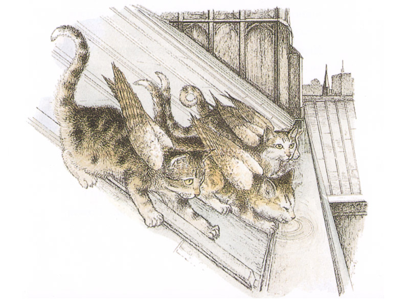 Вообще-то я крайне редко заранее читаю книги, предназначенные для чтения Ксюше вслух. Обычно просто заглядываю одним глазом, чтобы составить себе общее представление. Радость «открытия» книги мы должны испытать вместе с ребенком. Вот и в «Крылатых кошек» я только заглянула, но этого оказалась достаточно, чтобы понять – для Ксюши это будет книга-потрясение. Возможно, ничего более сильного мы пока не читали. Сила воздействия книги определяется, конечно же, мастерством и личностью автора. Но в «Крылатых кошках» еще и иллюстрации С.Д. Шиндлера такие, что даже человек, равнодушный к кошкам, может усомниться в этом своем равнодушии. Трудно представить какие-то другие, более подходящие иллюстрации к этому тексту.