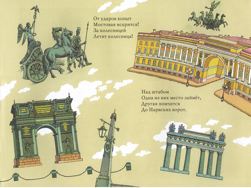 Представьте себе: золоченый ангел со шпиля Петропавловского собора и бронзовый ангел, венчающий Александрийскую колонну, вместе кружат над городом. Колесница богини Ники, запряженная шестеркой горячих коней, покинула арку Главного штаба и помчалась по мостовой. И за ней другая – та, что украшает Нарвские триумфальные ворота. А грифон с Банковского моста на канале Грибоедова пришел проведать белого льва, который живет по соседству, на Львином мостике.