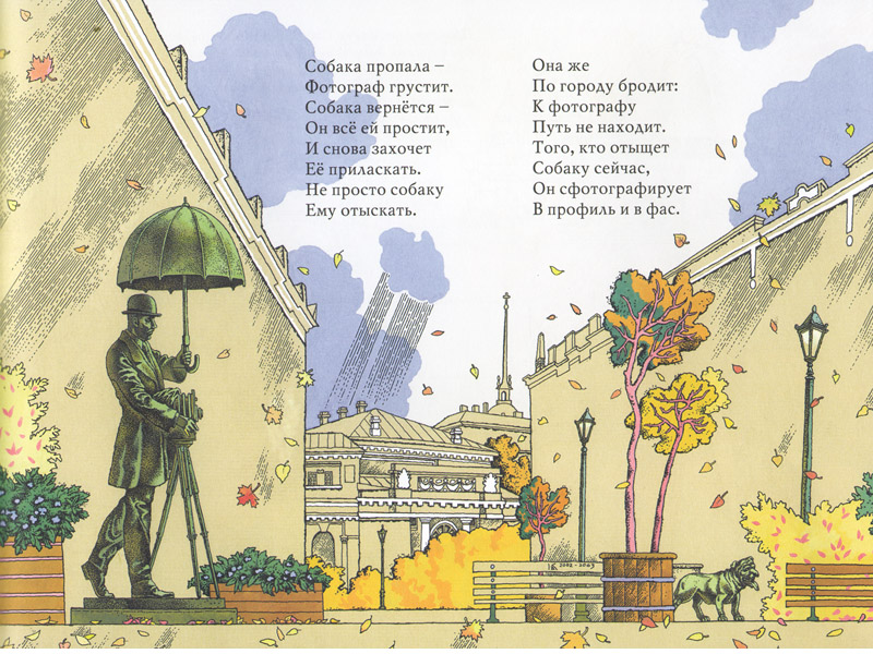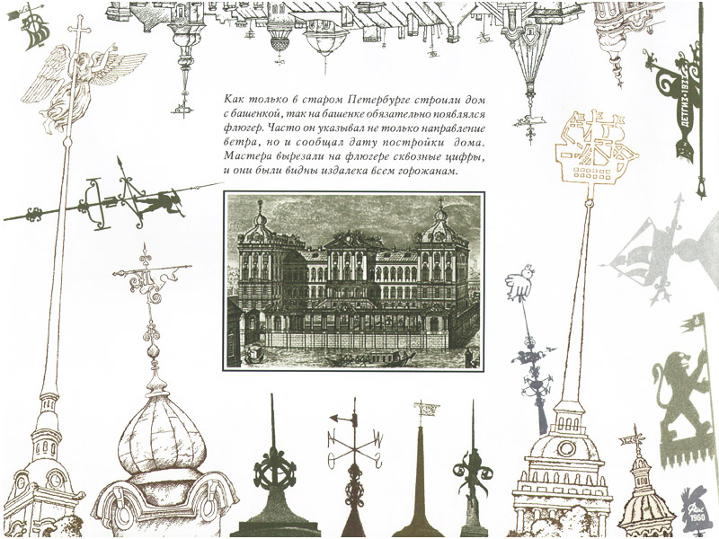 « – Мама, а что там делают эти люди?! – с удивлением спросил мальчик, глядя в небо. “Где, сынок?” – “Вон там, у Адмиралтейского кораблика”. Мама посмотрела и спокойно ответила: “Летают”. – “Для чего?!” – “Сочиняют книгу о городе…” – “Мама, а разве нельзя написать книгу о Петербурге просто сидя за столом?” – “Можно, только она получится совсем другая! Обыкновенная”».