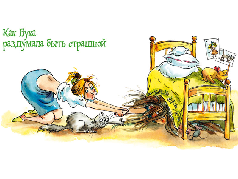 «В одной маленькой уютной квартире жила большая страшная Бука. Она была такая большая, что еле умещалась под кроватью. И когда на кровать ложились, то Буку даже немного придавливало к полу. Она страшно вздыхала.