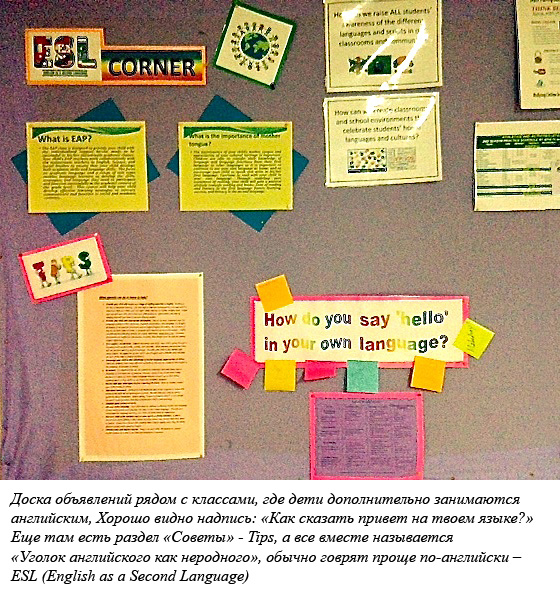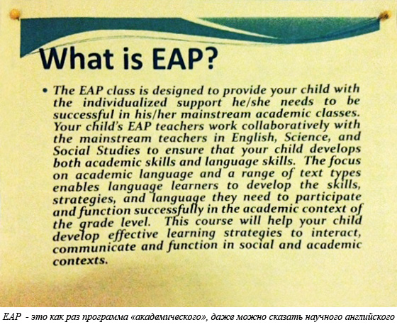 Начиная с пятого класса, в школе ведутся еще и дополнительные занятия по «академическому английскому». На них школьники учатся понимать разницу между разговорным языком сверстников и письменным языком сочинений или описаний опытов по физике. Эти занятия заменяют иностранный язык (так как один иностранный язык у этих детей уже есть) и являются обязательными. Иногда я очень жалею, что таких занятий нет у «носителей языка», они бы им тоже не помешали.