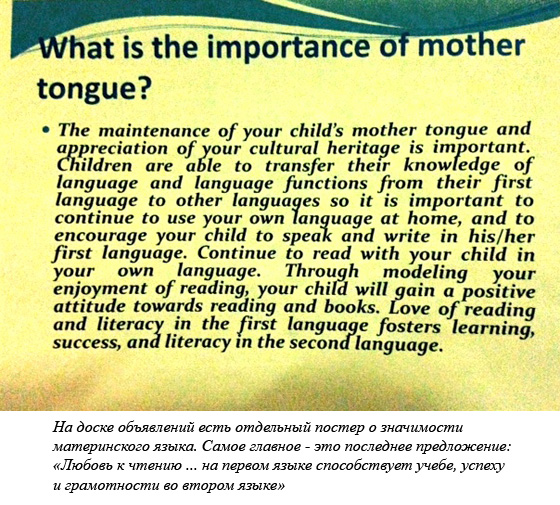 И все же самое интересное и самое главное, на мой взгляд, – это внимание к родному, первому языку конкретного ребенка. Все учителя и специалисты, с которыми я разговаривала, включая администрацию школы, говорят о необходимости сохранения первого, «домашнего» языка. Ребенок выучит язык школы – язык своих учителей и друзей, просто общаясь с ними, играя в футбол, отвечая на уроке. Но если не уделять внимание родному языку, то ребенок может его забыть, и моя собственная преподавательская практика показывает, что это случается очень часто.