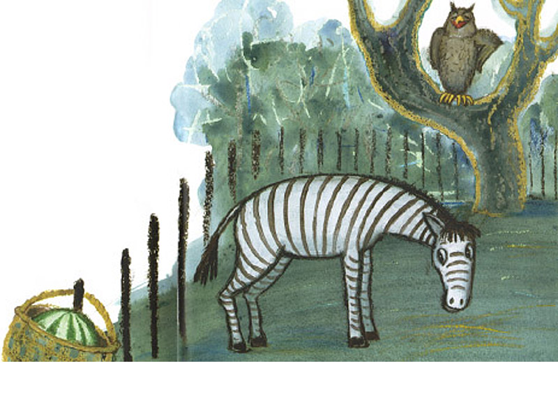 «Зебра долго не могла уснуть. Вдруг она услышала голос. Он доносился из кошелки сторожа:
