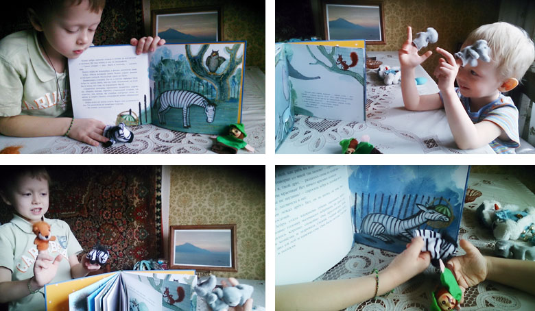 Поставили развернутую книгу ребром на стол, сразу обозначив сценическое пространство, и достали персонажей пальчикового театра из нашего игрушечного запаса, на ходу придумывая мизансцены. Сторожем зоопарка у нас оказался охотник из «Красной Шапочки» – а почему бы и нет, он все равно без ружья, зато с колоритными усами и шляпой. Зеброй была крохотная зебра, серым слоном – слон, а вот рыжую белку, которой не было в нашем наборе, пришлось заменить рыжим же львом, но никто огорчен не был: Макар внес маленькую поправку в текст, и мы согласились – игра имеет свои законы. Музыкальным сопровождением спектакля послужила мелодия музыкальной шкатулки. Это было очень красиво, словно хрустальные шарики перекатываются и сталкиваются ‒ музыка вполне под стать нежности неожиданной дружбы арбуза и зебры. Текст «от автора» исполняла мама, в роли зрителей выступал четырехмесячный Федя. Митя с Макаром оживляли своих героев, выдавая их реплики строго по тексту, и оживлялись сами. Федя слушал и улыбался. Улыбались и довольные актеры.
