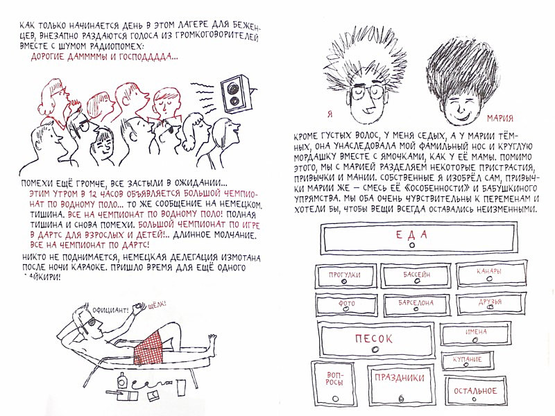 – Мне кажется, что у комикса нет границ, с помощью комикса можно говорить на любую тему: и о смерти, и о боли, и о радости. Так же, как и с помощью кино и литературы. Комикс – хорошая форма для того чтобы поставить проблему. Для меня комикс – это поэзия соотношения текста и рисунка. Нужно очаровывать людей историями, так как каждая хорошо рассказанная история доходит до сердца людей. А истории из жизни Марии можно рассказывать с помощью поэзии, фантазии, шутки. Ведь жизнь – это драма, пока кто-то не пошутит. Многие видят историю Марии драматичной, депрессивной. Я ее так не вижу, я просто рассказываю о том, как мы живем. У меня в запасе так много историй, которые можно рассказать о Марии! Эта книга родилась из сердца, я думал над ней лет пять или шесть и сделал ее прежде всего для того, чтобы понять тот мир, в котором живет моя дочь, чтобы помочь понять его матери Марии, а также всем родителям и людям, которые сталкиваются с подобной проблемой. Мне хотелось рассказать всем историю Марии.