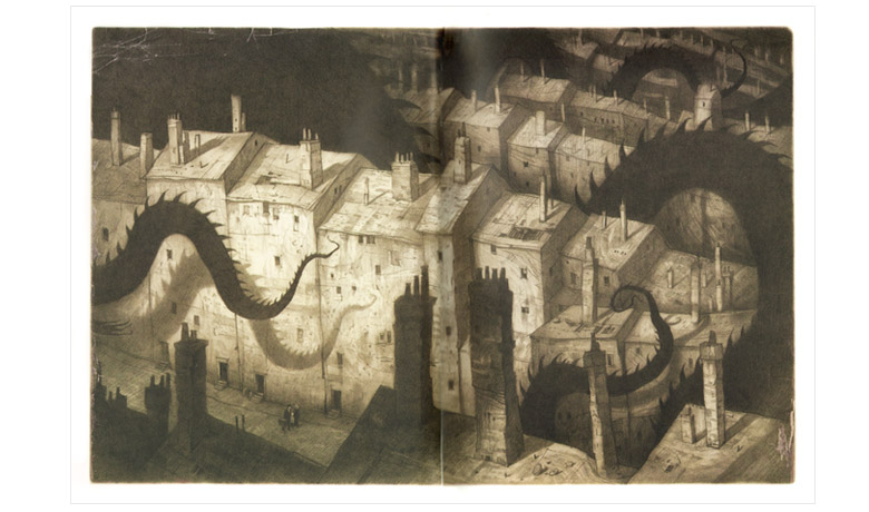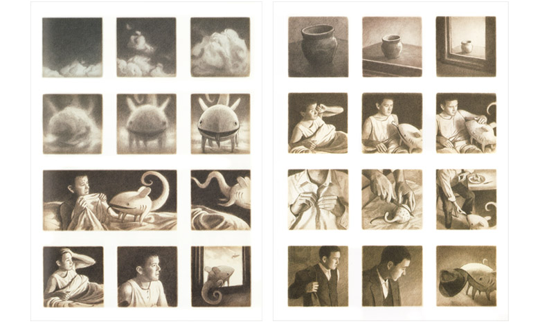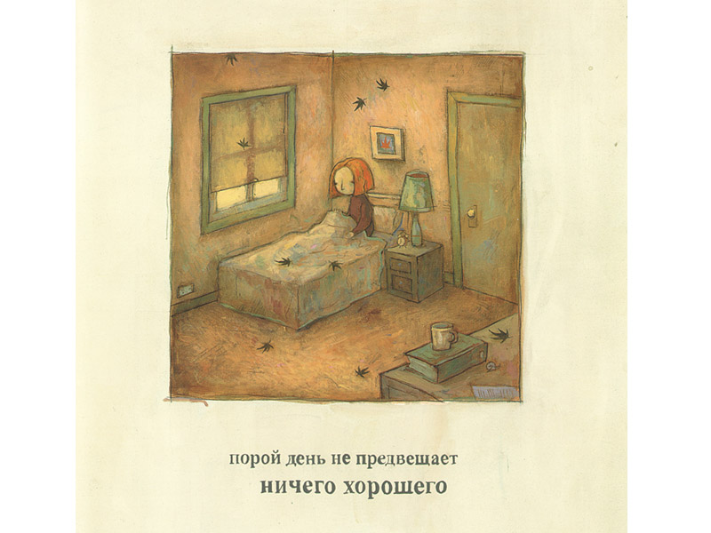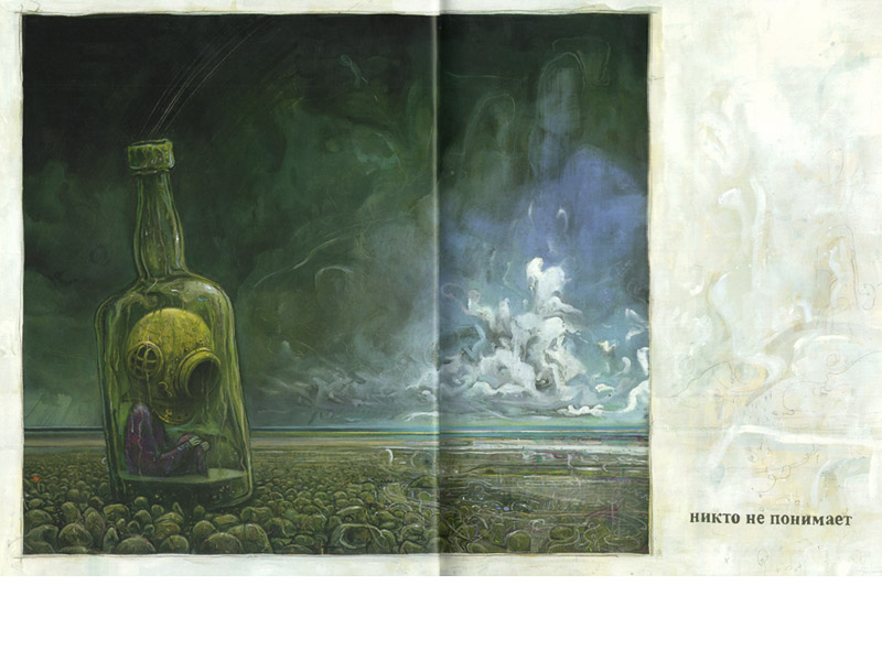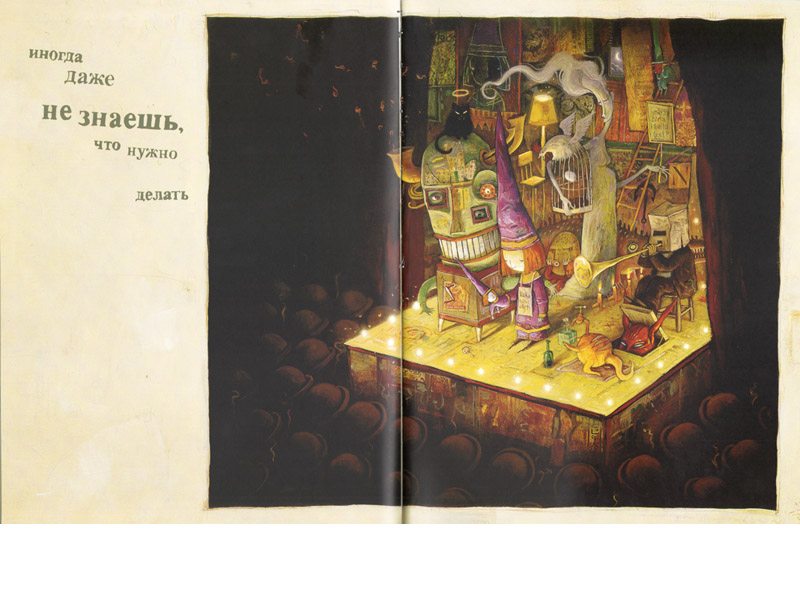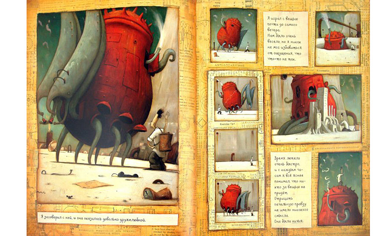 «Меня привлекает такое интуитивное понимание, когда необязательно объяснять, что мы видим, ‒ продолжает Шон Тан. ‒ Например, в книге есть существо – что-то среднее между кошкой и головастиком, оно очень хочет подружиться с главным героем. У меня есть свое понимание этого существа, оно связано с желанием быть принятым, с поиском общности, но мне трудно полностью выразить это словами, проще нарисовать».