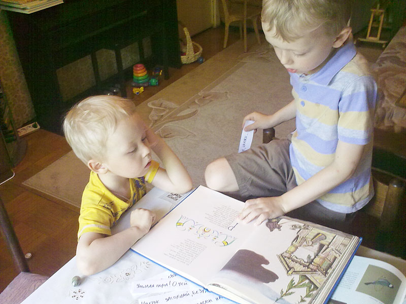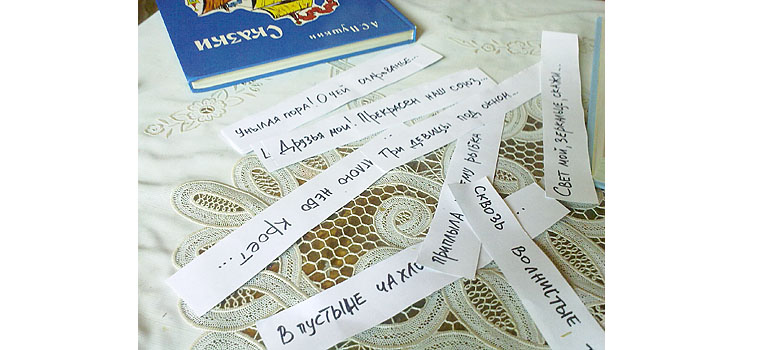 В прошлом году по условиям игры мы должны были припомнить как можно больше первых строчек разных пушкинских стихотворений и записать их на длинный рулон бумаги (он занял почти весь ковер на полу в детской). За год дети подросли (Ане уже девять, Макарику почти семь), к тому же, мы несколько раз перечитывали пушкинские сказки, да и многие стихи тоже. Поэтому теперь задача существенно усложнилась. На стол были выложены бумажные полоски с первыми строками произведений, например такие: «Мороз и солнце, день чудесный…», «Октябрь уж наступил…» «Ветер по морю гуляет …», «Приплыла к нему рыбка и спросила…». Нужно было постараться вспомнить текст дальше и рассказать как можно больше. Тот, у кого получалось, забирал билет себе. В этот раз мы почти обошлись без подглядывания в пухлый пушкинский том, и билеты со строками кончились как-то слишком быстро.