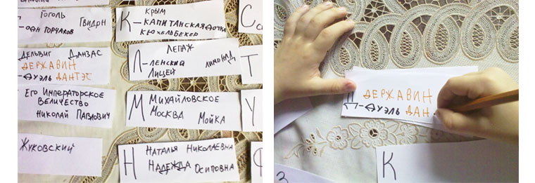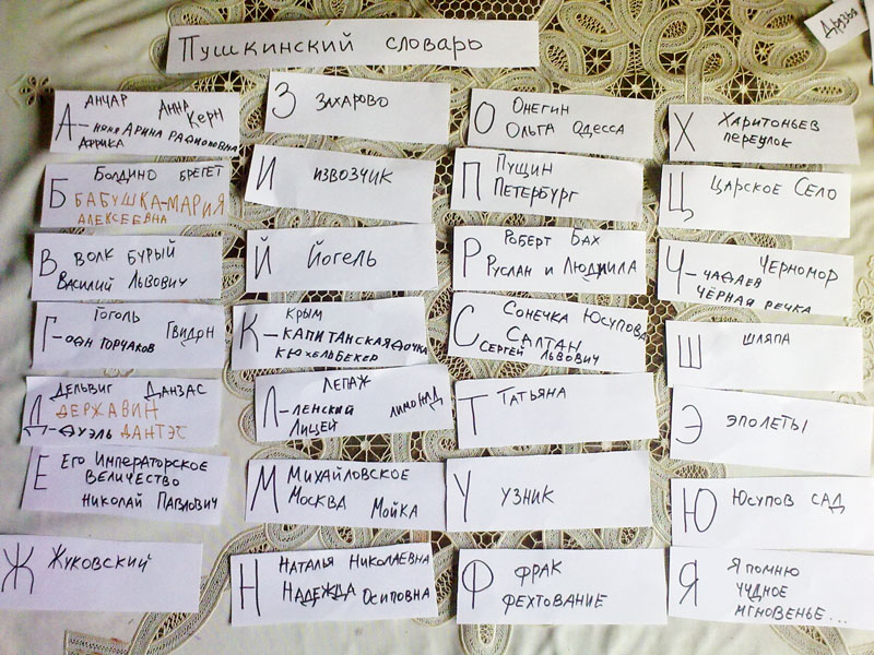 Вторая игра – в словарь – тоже получилась на удивление динамичной, хотя сначала представлялась мне довольно «сырой». Но огромное «родословное древо Пушкина», которое мы расстелили на полу, и несколько коротких рассказов о судьбе поэта предоставили массу материала для игры. На полосках бумаги с буквами алфавита нужно было написать любые слова (можно несколько вариантов), связанные с жизнью Пушкина (имена его родных и друзей, героев его книг, места, где он жил, предметы быта). Через десять минут «Пушкинский словарь» был готов. Только буквы Щ и Ё остались без подходящих слов, но, может, мы что-то упустили?