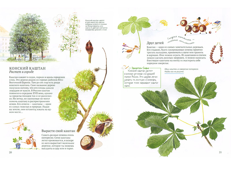В книге описываются деревья, которые распространены и в России. Вот, например, хорошо знакомая нам липа сердцевидная. Листья у нее – как сердечко с зубчатым краем. Липа цветет в середине лета, позже других деревьев. Мелкие светло-желтые цветки, хоть и неприметны, обладают тонким ароматом. Липовые плоды похожи на маленькие барабанные палочки. К семенам прикреплен листик, который служит парашютом, когда они разносятся ветром.