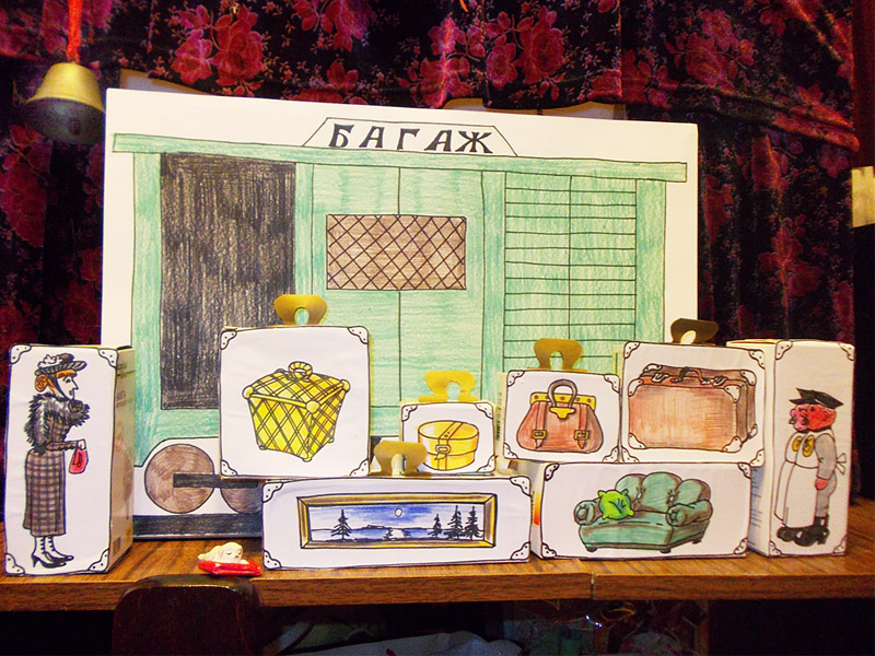 На перроне появляются дама – хозяйка багажа, и вещи, перечисленные в стихах: старомодный диван, тяжелый чемодан с металлическими уголками, кожаный саквояж, перетянутый ремнями, плетеная дорожная корзина, шляпная картонка (все эти старинные вещи мы уже видели в краеведческом музее). И наконец, на сцену выходит маленький щенок. Он торжественно водружается на гору вещей.