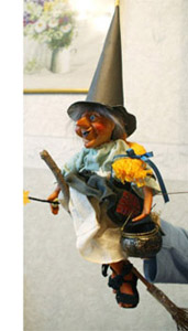 Из укрытия вылетает ведьма вместе с котом. Читая соответствующий стих, перемещаем ведьму из одной руки в другую и кружим ею из стороны в сторону.