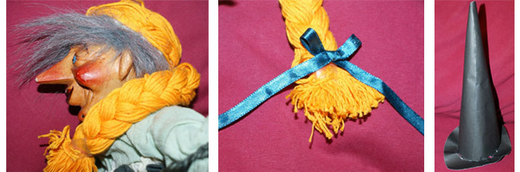 В сказке Джулии Дональдсон ведьма была рыжей. Берем оранжевую пряжу для вязания, нарезаем длинными полосками, складываем пополам и заплетаем косу. Я пришивала часть пряжи к тем волосам, которые были у сувенирной куклы.