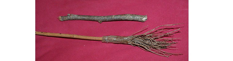 Метла. К палочке прикрепляем тоненькие веточки проволочкой или скотчем. Должна быть еще короткая палочка: когда метла будет разламываться, этот кусочек останется у ведьмы.