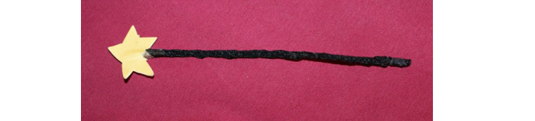 Волшебная палочка. Любую палочку оплетаем ленточкой и закрепляем края клеем. Сверху прикрепляем звездочку, вырезанную из двойной бумаги. К ведьминой руке палочку прикрепляем пластелином ‒ она должна легко отцепляться и прицепляться.