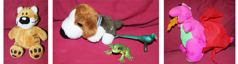 Пес желательно чуть меньшего размера (кот все же был толстяком). Птичка с лягушкой ‒ маленькие резиновые игрушки (всех потом предстоит посадить на метлу, так что они должны быть небольшие).
