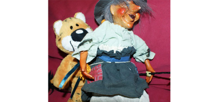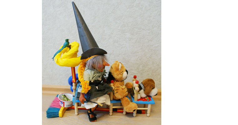 Обычно я вначале прячу всех персонажей за коробку или подушку, чтобы не привлекать к ним внимание зрителей (а можно просто прикрыть всех платком). На ведьме надета обычная канцелярская резинка: когда звери подсаживаются к ней на метлу, мы их крепим, сажая за эту резиночку, а в конце, когда они все падают, разрезаем резинку ножницами.