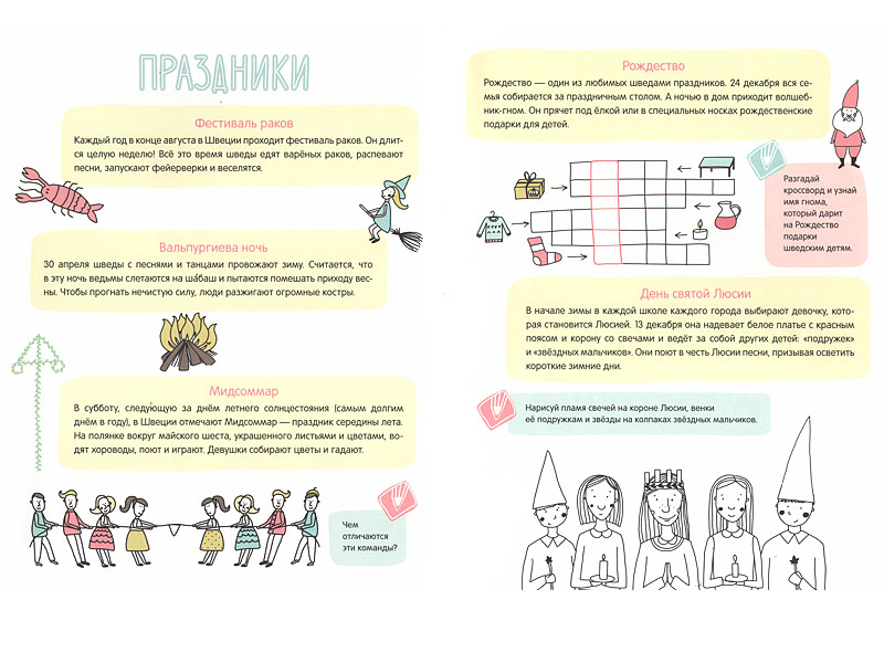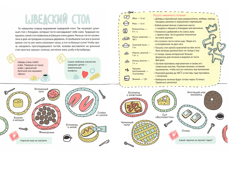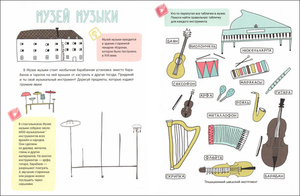 Впрочем, с книжкой можно познакомиться и заранее, еще до поездки. Например, испечь дома традиционное шведское имбирное печенье по рецепту, предложенному на одном из разворотов, раскрасить черно-белые рисунки и выполнить какую-то часть заданий. Приходя потом на экскурсию в парк сказок Юнибакен или в стокгольмский Музей музыки, ребенок будет уже довольно хорошо представлять себе, куда он попал.