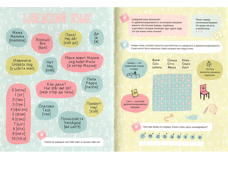 Книга выдержана в классической манере современных детских энциклопедий с маркировкой «6+»: крупный шрифт, яркие веселые картинки, информация подается небольшими порциями и адаптирована к уровню восприятия старших дошкольников и младших школьников. Из «Веселого путешествия» можно узнать, например, как зовут нынешнего шведского короля, почему самый большой корабль шведского флота пошел ко дну, почему шведы любят вырезать из дерева и выпекать из теста фигурки лошадок и лосей, а также о том, что на воинском шлеме викингов на самом деле никогда не было рогов. Маленькие читатели с удивлением обнаружат, сколько, оказывается, знакомых слов и предметов пришло в нашу жизнь из Швеции: спичка, застежка-молния, детское автокресло, пропеллер, кнут и даже обыкновенный стул. А если приведенной в книге информации о Стокгольме кому-то покажется недостаточно, можно пройти по ссылкам стокгольмских музеев и парков, указанным на последней странице, и составить собственный вариант путеводителя (правда, эта задачка подойдет детям постарше, начиная лет с десяти.)