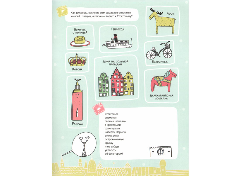 Но занимательная информация – не самое главное достоинство книжки. Кто путешествовал с ребенком, знает, как быстро дети утомляются при езде в транспорте и как непрочно запоминают рассказы экскурсоводов на слух. От скуки в дороге родители обычно запасаются всевозможными раскрасками, кроссвордами и альбомами с наклейками, а экскурсии предпочитают исключительно интерактивные (присвоение нового знания через самостоятельную практическую деятельность – базовая потребность детей 5?8 лет). «Веселое путешествие» хорошо прежде всего тем, что с этой книжкой надо все время что-нибудь делать, а не только читать или слушать чтение взрослых. Необычные задания, перемежаясь с небольшими текстами, с разных сторон открывают маленькому ребенку Стокгольм. Каждый книжный разворот – это небольшое игровое поле, где очень весело, интересно и всегда неожиданно. Кажется, авторы использовали в книге все возможные варианты детских игр на бумаге – от раскрашивания, вырезания, решения логических задачек и прохождения лабиринтов до расшифровки секретных письмен (скандинавских рун), написания тайных посланий и поиска мелких предметов, рассыпанных по страницам книги (в данном случае, это 30 корон, которые надо найти в разных местах). Для детей, любящих самостоятельно ориентироваться в незнакомом месте, в книге есть рисованная карта Стокгольма с основными достопримечательностями. По их фрагментам, вставленным в круглые окошки, можно попробовать отыскать все здание целиком – сначала в книге на карте, а потом и на городской улице. На одном из разворотов можно проложить собственный велосипедный маршрут по городу, на другом – немножко поучить шведский язык, чтобы хотя бы в нескольких словах поддержать диалог с местными жителями (шведские слова даны с транскрипцией, дублированной по-русски).