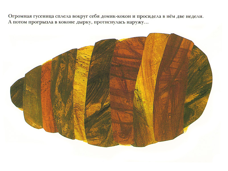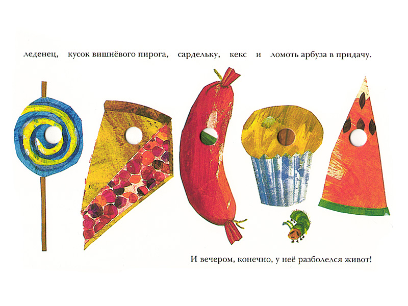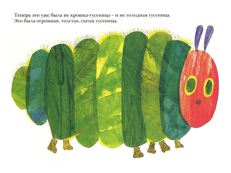 Прожорливый червячок в результате превратился в гусеницу, очень голодную. Дырочки нашли себе место в яблоке, грушах, сливах, апельсинах и совсем невероятных вещах вроде тортов и мороженого. А все вместе стало книжкой из толстого картона с необычно устроенными страницами, на которых каждый – и ребенок, и взрослый – ясно видит следы, оставленные голодной гусеницей. Видно, как она «ползет» со страницы на страницу и с каждым новым деянием по поеданию разных вкусностей становится все больше и больше, толще и толще. Так что в конце концов становится сытой, толстой, огромной гусеницей. Сытая гусеница плетет себе кокон, а на последнем развороте превращается в чудесную, разноцветную бабочку.