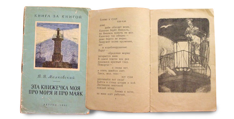 – «Это книжечка моя про моря и про маяк» Маяковского. Она была издана, по бедности послевоенного времени, на серой в крапинку бумаге с графическими черными рисунками. Книжка мне страшно понравилась – там же было море, солнце, маяк! И когда я ее прочел, то первым делом схватил цветные карандаши и всю эту книжку разрисовал. И получил такой нагоняй от родителей! Будь здоров! Но удержаться не мог. Книжка же про цвет, а цвета в книжке нет.
