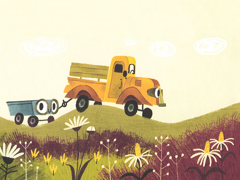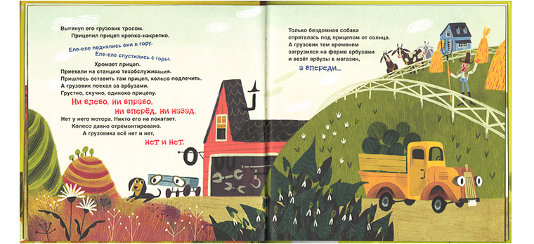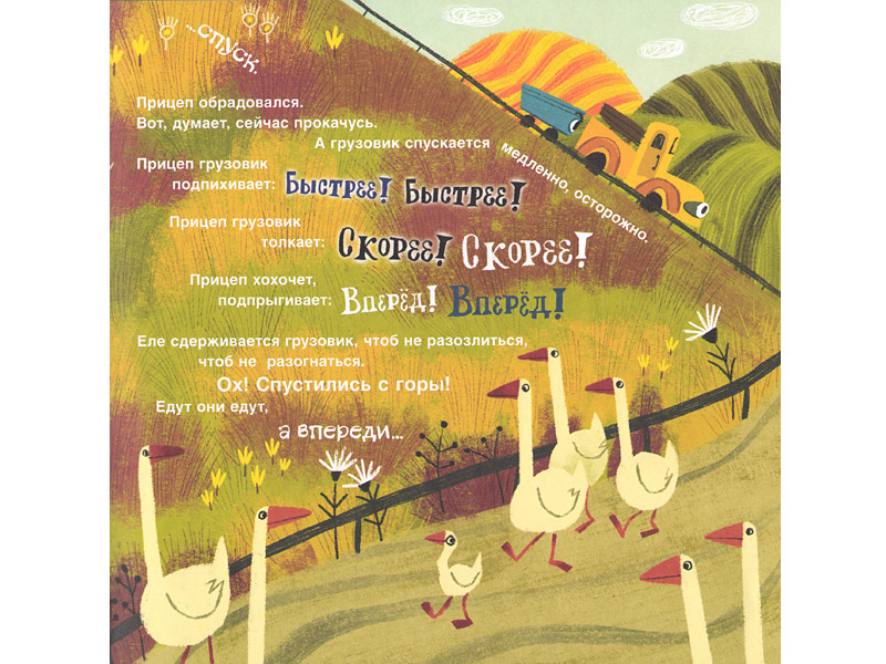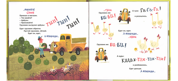 Это довольно смелый авторский ход: обычно сюжет в книгах для маленьких выстраивается прямолинейно. Но путаницы не происходит. Ребенку вполне по силам проследить и динамическую составляющую сюжета (взрослый грузовик везет в магазин арбузы), и эмоциональную линию, связанную с переживаниями прицепа.