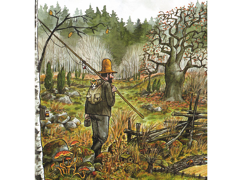После еще нескольких уловок и хитростей Финдуса старик, наконец, сдается и идет к озеру. Читатели так и не узнают причину плохого настроения Петсона: оказавшись на природе, он и сам забывает, отчего еще недавно так грустил. Вместе с героями мы видим осенний пейзаж, раскинувшийся на целый разворот: «Серое озеро, серое небо, темный лес вокруг... Листва уже облетела, яркие краски лета уступали место зимней палитре. Все кругом было серо-зеленым и коричневым. От влажного воздуха цвета стали насыщенными, и лес как будто светился». Дети еще не могут формулировать мысли так поэтично и развернуто, они выражают свои впечатления восторженными паузами: «Такая одна большая картинка! Такое всё...!»
