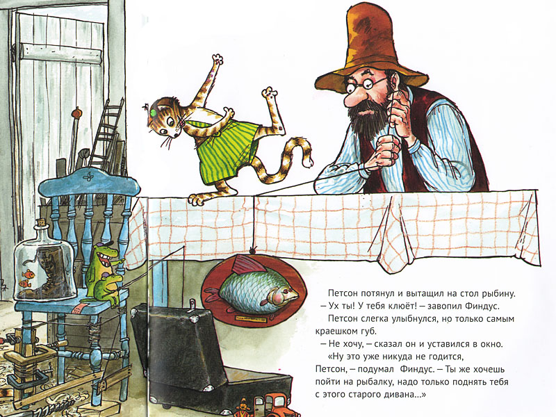 Только теперь котенок понимает серьезность ситуации и начинает придумывать способы, как развеселить старика. И если в самом начале истории он исходит исключительно из своих интересов («Значит, будем весь день играть»), то теперь ориентируется на предпочтения самого Петсона. Способность встать на место другого, по мнению психологов, формируется примерно к 6-7 годам. Конечно, истории про Петсона и Финдуса будут интересны и детям помладше, но именно эта хорошо показывает взросление ребенка, который уже способен посмотреть на вещи и события с чьей-то другой точки зрения.
