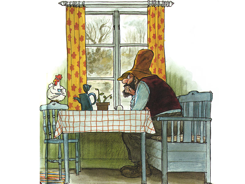 Финдус явно не из таких. Энергия бьет в нем ключом, он весело прыгает и скачет, поначалу не слишком переживая, что Петсон сидит сиднем и смотрит в окно. Иллюстрации Нурдквиста всегда завораживают, особенно, когда передают «скоростные» перемещения героев. Слушатели, конечно, реагируют на картинку, где Финдус крутится по всей кухне: «О, Финдус прямо везде!»