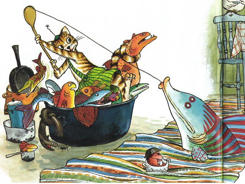 До этого эпизода описание происходящего было реалистичным, а иллюстрации, наоборот, полны условностей и гротеска, так что теперь слушатели оказались в некотором замешательстве. Начинается дискуссия: «Откуда у него рыба? Он ее нарисовал и вырезал?» – «Из коврика!» – «Это настоящая щука?» – «Нет, выдуманная! Не бывает таких полосатых щук! Щуки не полосатые!» – и наконец кто-то подытоживает: «Это он так играет!»