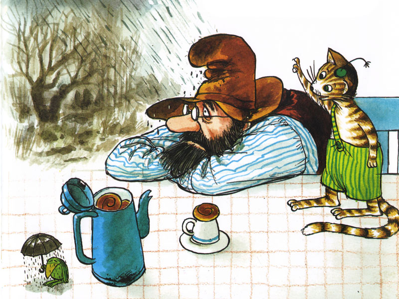 Дети снова хихикают: орущий взрослый смешон, если не несет прямой угрозы лично тебе. Финдус, похоже, шокирован таким поведением Петсона и не знает, как реагировать: «Котенок уставился на хозяина. Таким злым он Петсона никогда не видел».