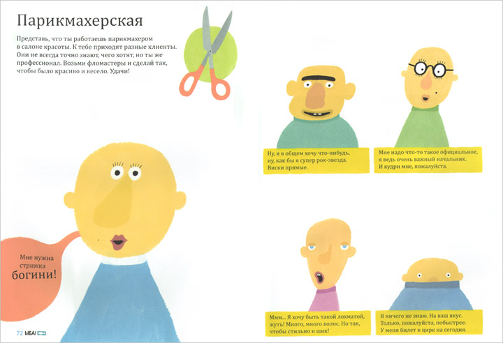– Это как приглашение к игре. Приходи ко мне в гости и давай поиграем! Вот в такую игру можно поиграть, или в такую. Это не обязательное требование. Можно и не принимать приглашение к игре, а просто смотреть. Но я, конечно, мечтаю, чтобы какие-то игры ребенок освоил в «ЫБЕ», а потом перенес их в свою собственную тетрадку. К примеру, я предлагаю подобрать персонажам прически. Потом можно самому придумывать персонажей и как-то необычно их «причесывать».
