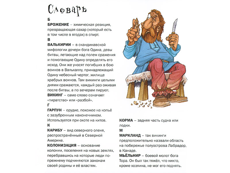 А картинки в книге смешные и запоминающиеся. У каждого викинга есть свое «лицо» и характер, и среди них всегда можно отыскать того самого, в меховых штанах, вместе с которым маленький читатель участвует в экспедиции. Кроме того, здесь много поясняющих рисунков. Например, устройство драккара, длинного корабля викингов, построенного без единого гвоздя.