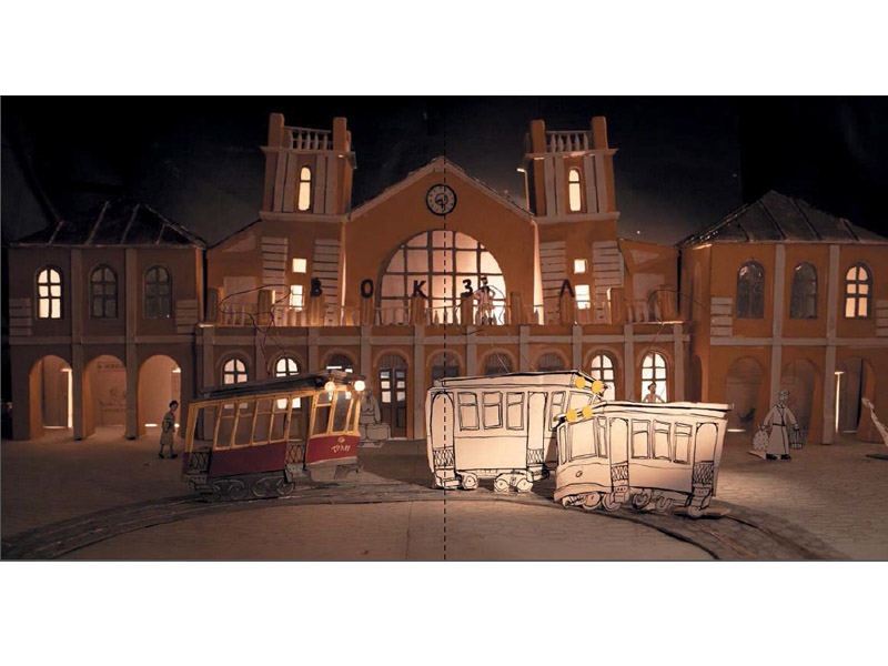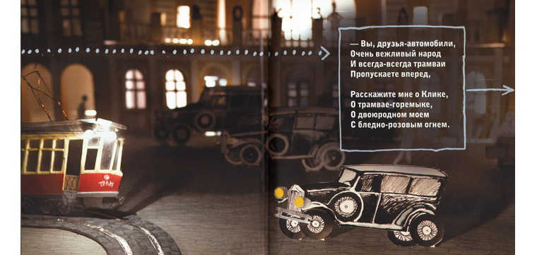 Как же выглядели эти трамваи? Клик и Трам «с красной площадкой и спинкой горбатой», токоприемником, «рассыпающим фейерверк», и парой фонарей над кабиной вагоновожатого, цвет и сочетание которых были обозначением маршрута – так пассажиры даже в сумерках могли издалека узнать «свой» трамвай. «Маршрутные огни» были основных контрастных цветов, а у «сонного трамвая» Клика – «бледно-розовые». Один из них гаснет: