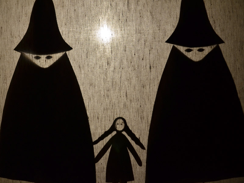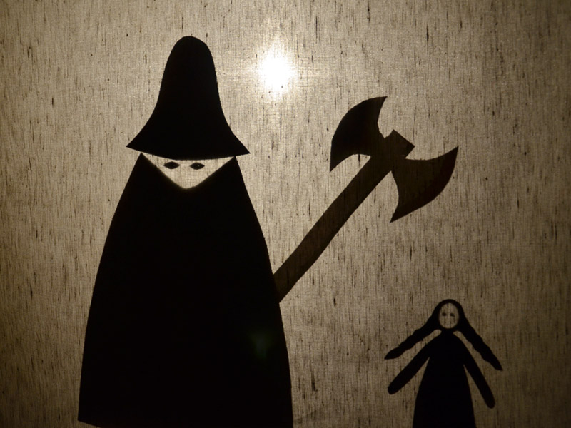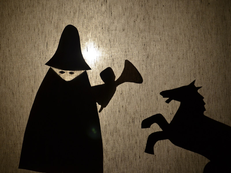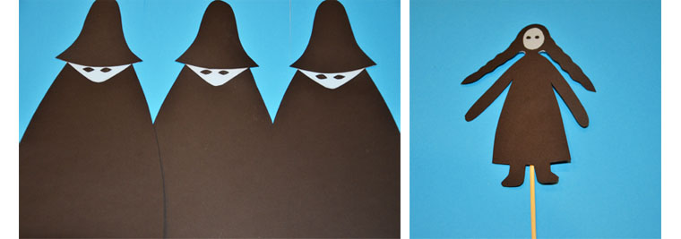 Из картона размером А4 мы сделали фигурки разбойников: плащ и шляпа, а между ними ‒ прозрачная вставка из кальки, с черными свирепыми глазами. Для удобства управления снизу к фигуркам были приделаны деревянные палочки.